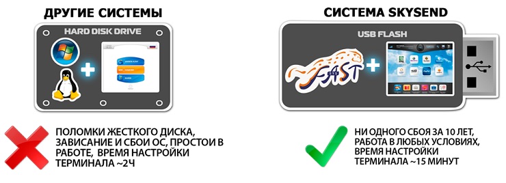 Система предоставляет участникам рынка приема платежей современную и качественную альтернативу: терминалы всех систем работают по схожему принципу – устанавливается ОС Windows, либо Linux и в автозапуске ПО терминалов. В отличие от данных решений мы создали собственную операционную систему и интегрировали ее с ПО терминалов. Всего за 1 минуту система FastSYS прошивается на flash-накопитель, устанавливается в терминал, при загрузке определяет автоматически все устройства. С учетом времени на регистрацию точки в течении примерно 15 минут терминал готов к работе, нет необходимости устанавливать операционную систему, драйвера устройств, конфигурировать дополнительное ПО.