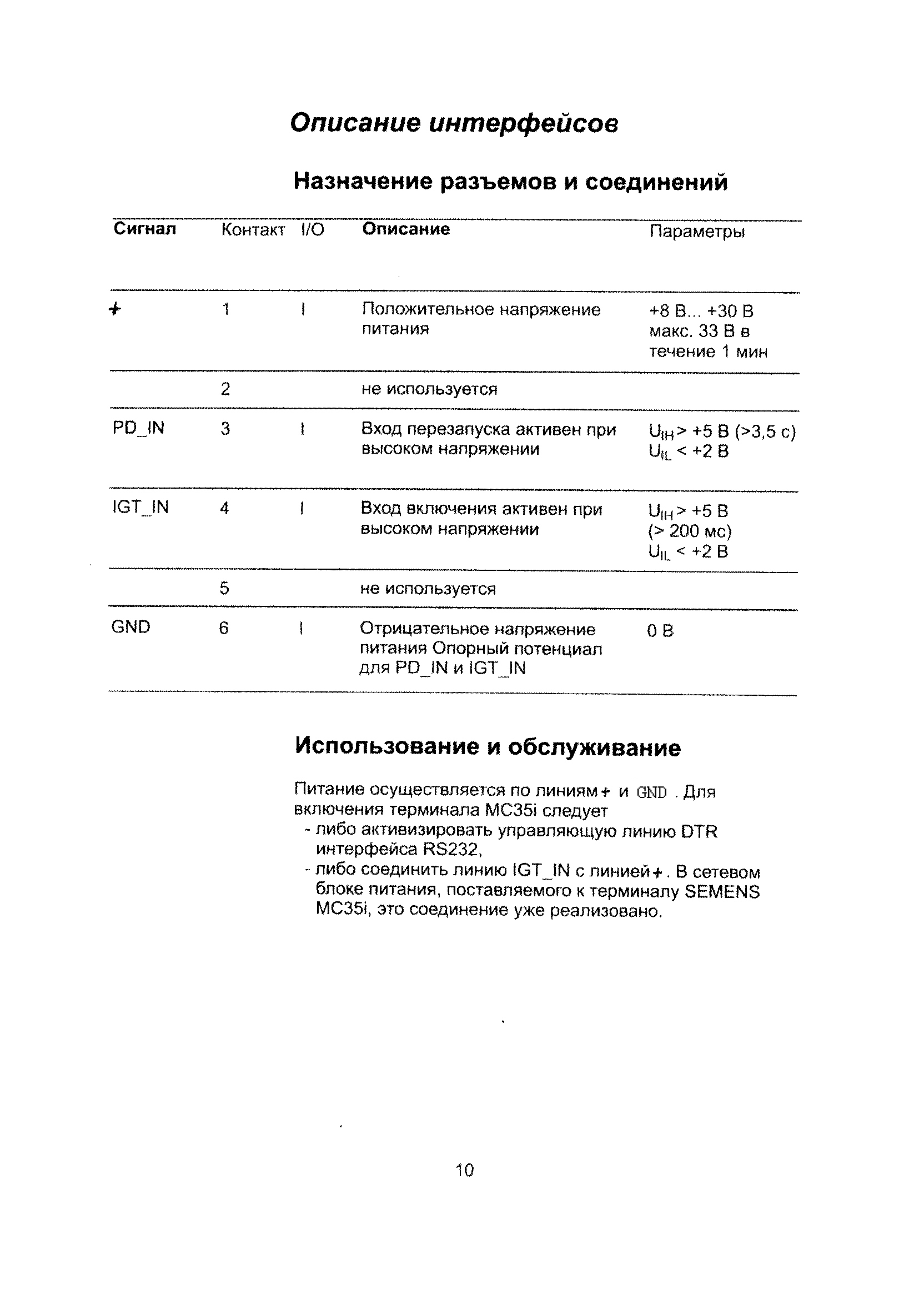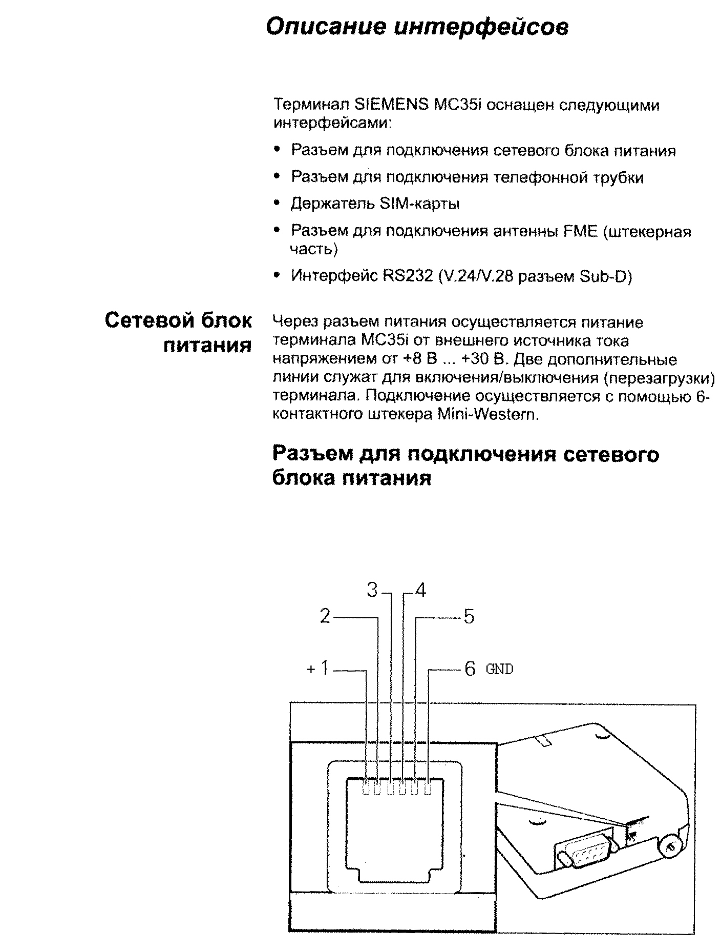 Схема разъема сетевого подключения GPRS модема Siemens MC35i