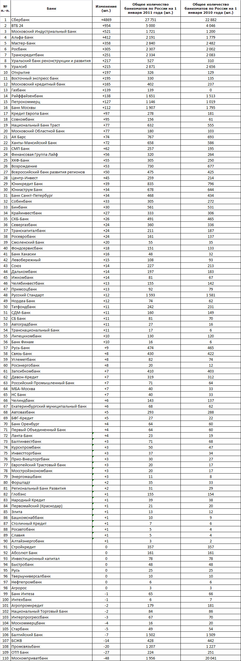 ? вслед за Сбербанком идет группа банков, динамично развивающая сеть банкоматов. Банки, установившие за год от 100 до 900 банкоматов, это: ВТБ 24, Московский Индустриальный Банк, Альфа-Банк, Мастер-Банк, Росбанк, Транскредитбанк, Уральский банк реконструкции и развития, Уралсиб, Открытие, Восточный экспресс банк, Московский кредитный банк, Газбанк, Райффайзенбанк, Петрокоммерц, Банк Москвы;