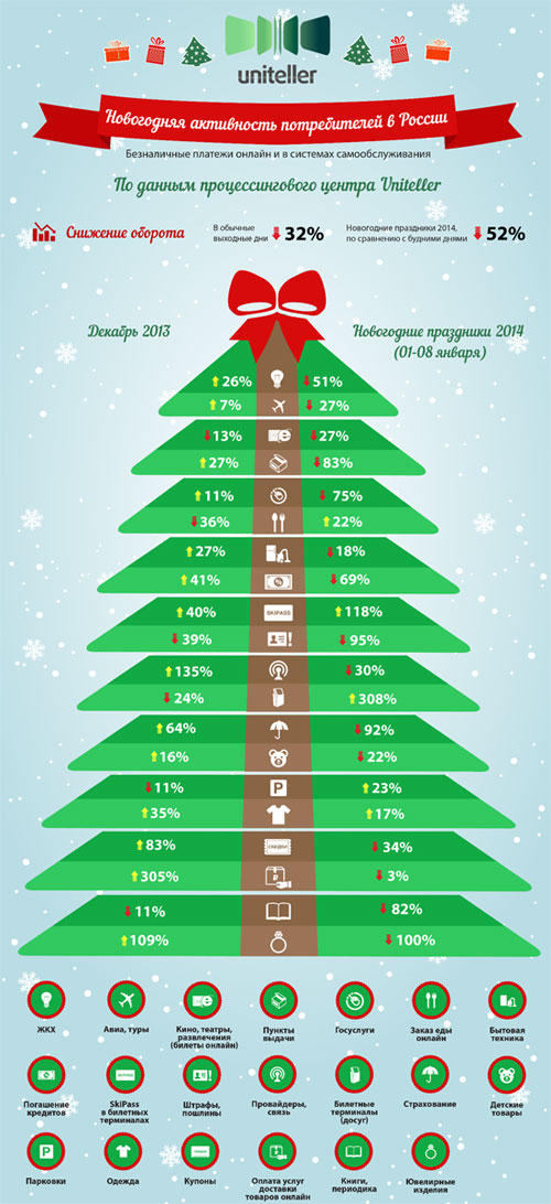 Процессинговый центр Uniteller представил статистику потребительской активности в сфере безналичных платежей в предновогодний период и на зимних каникулах 2014.