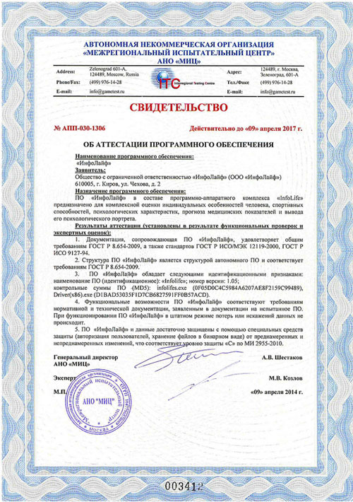 Поэтому нами было принято решение пройти добровольную сертификацию нашего программного обеспечения. По Сертификату соответствия и Свидетельству об аттестации ПО - которые были выданы нам, программное обеспечение InfoLife соответствует: ГОСТ Р 8.654-2009, ГОСТ Р ИСО/МЭК 12119-2000, ГОСТ Р ИСО 9127-94, а так же уровню защиты «С» по МИ 2955-2010.