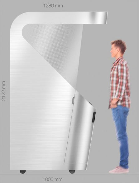 Эта технология позволяет людям получать доступ к медицинской информации, финансовым и социальным услугам даже в отдаленных районах. Это дает реальную возможность поговорить с настоящими людьми с прямым зрительным контактом, чтобы получить информацию об общественных местах, таких как торговые центры, аэропорты, правительственные учреждения и больницы. Вы можете использовать дисплей с сенсорным экраном, чтобы выбрать любые запросы или заставить выглядящего настоящим человека выполнить определенные задачи, такие как печать документа или выполнение просмотра какого-нибудь файла. Алюминий – основной материал, используемый для производства этого киоска.