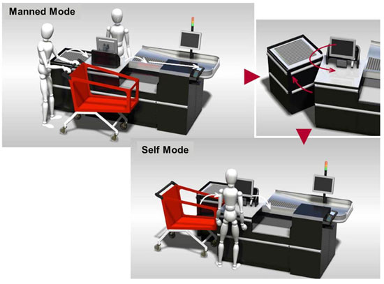 И этим не исчерпывается возможность варьирования конфигураций. Если раньше одним из существенных вопросов было «Можно ли ставить Self-checkout «спина к спине» с возможностью фронтального сервисного обслуживания?», то сейчас к нему добавляется «А можно ли превратить self-checkout в полноценную кассу на случай увеличенного – дневного или сезонного – потока покупателей?». И если удобство фронтального сервиса уже есть возможность оценить у нескольких вендоров, то касса U-Reverse от Fujitsu с поворотной платформой пока еще новинка. Она позволяет за несколько секунд переориентировать покупателя с прохода с лицевой стороны селф-чекаута на тыловую, а кассиру начать «разгружать» накопившуюся очередь.