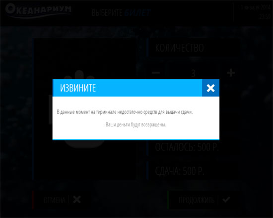 Если на терминале недостаточно наличных, чтобы выдать сдачу, пользователь получит соответствующее сообщение и внесенные средства. Деньги возвращаются и в случае проблем с фискальными регистраторами, а так же при невозможности провести продажу или получить штрих-код для билета от сервера ДевПарк.