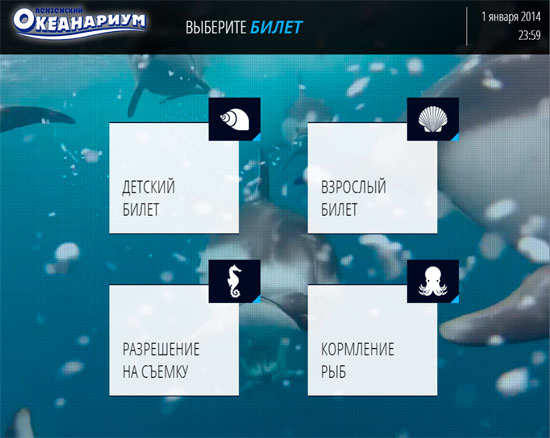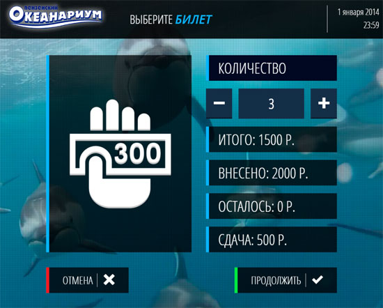 Оплатив заказ, пользователь получает сдачу и входные билеты со штрих-кодом, используя которые можно пройти через турникеты в океанариум.