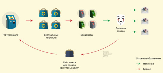 Главная проблема для обнальщика кроется в том, откуда достать сами бумажные купюры, не засветившись при этом перед налоговой, правоохранительными органами или Центральным банком. Помимо источников в виде заведений и магазинов, в принципе работающих в черную и не имеющих кассовых аппаратов, этот рынок в основном использовал обнальные схемы банков, с выводом средств через офшоры. Тут-то в начале 2000-х годов на сцену российского «обнального» рынка и выходит уличный автомат для приема микроплатежей — платёжный терминал.