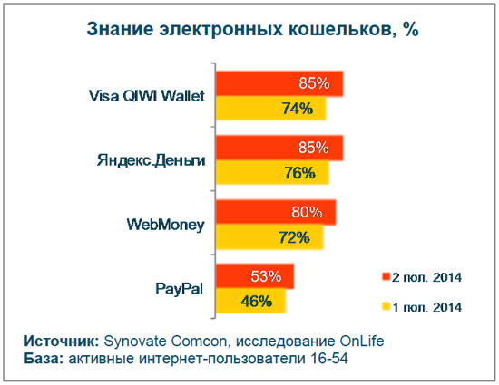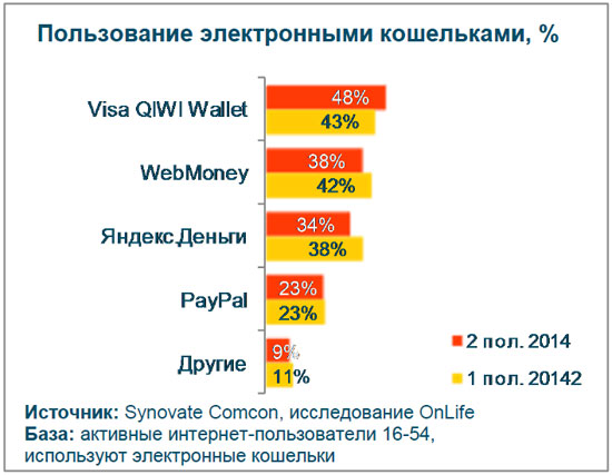 Во второй половине 2014 года доля активных интернет-пользователей, отдавших предпочтение Visa QIWI Wallet, выросла по сравнению с данными первого полугодия текущего года (с 43% до 48%). PayPal стабилен на уровне 23% пользователей.