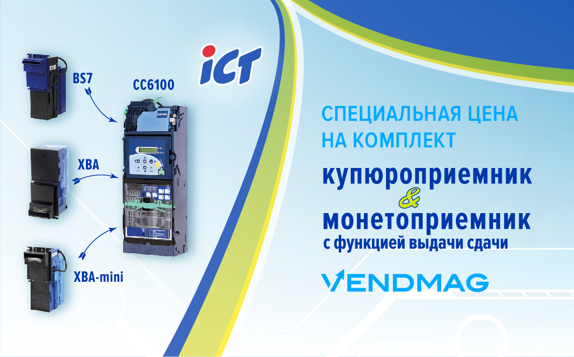 ВендМаг предлагает специальные цены при покупке комплекта купюроприемник + монетоприемник с функцией выдачи сдачи CC6100 от ICT.