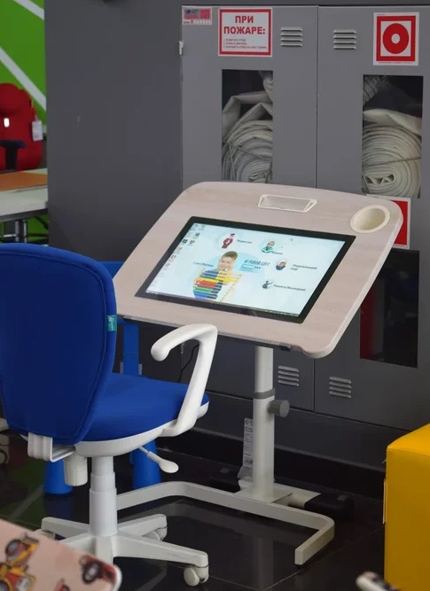 Стильная в дизайне парта с ярким дисплеем и максимально скоростным откликом экрана. Стекло ударопрочное, не бьётся, не тормозит, безопасный для детей каркас с закруглёнными углами. Ничего сложного для учителей и родителей — внутри находится самый обычный ПК на Windows.