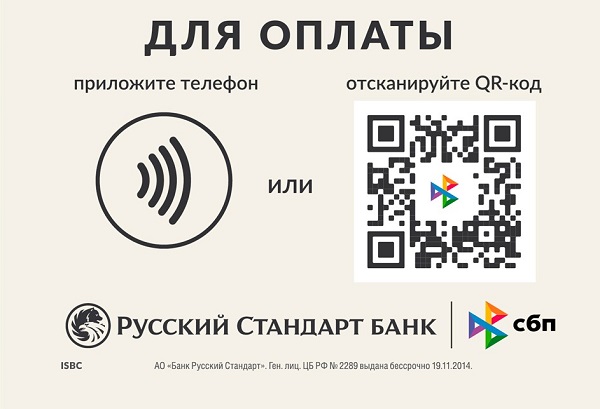Технология оплаты проста – покупателю достаточно приложить телефон (Android или iOS) к табличке с NFC-меткой. Далее клиент будет автоматически направлен в мобильный банк для подтверждения платежа. Если оплата совершается с помощью приложения СБПэй, дополнительных подтверждений не потребуется, оплата пройдет в одно касание. Также платеж можно провести, и просто отсканировав QR-код с таблички через СБПэй, либо через свой мобильный банк*, подтвердив операцию уже в нем. Техническую возможность проведения таких платежей обеспечивает Банк Русский Стандарт.