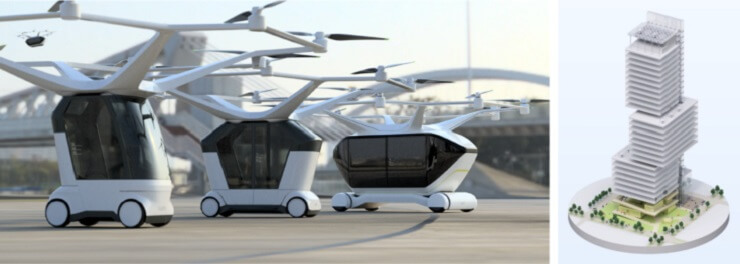 VTOL, предложенный Mitsubishi Jisho Sekkei, представляет собой полностью автономную модульную систему мобильности, состоящую из трех блоков: винта, кабины и движущей силы. Он функционирует совместно с портами взлета и посадки, обеспечивая бесперебойную связь не только между портами по воздуху, но и между воздухом и землей.