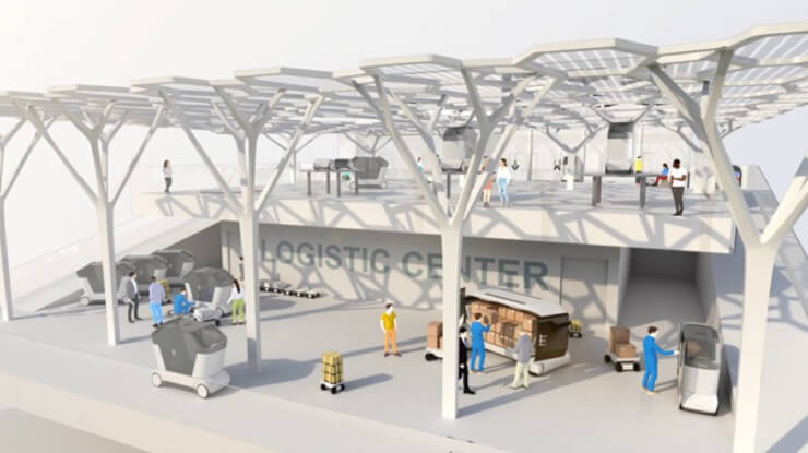 Рядом с крышей оборудована погрузочно-разгрузочная площадка для транспортировки грузов воздушным транспортом. Это позволит сократить объем пространства, используемого для погрузки и разгрузки на первом этаже, а также для хранения. Создание более открытого городского пространства.