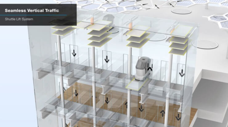 Вертикальный транспортный поток для перемещения Podbus добавляет зданию новую функцию. В отличие от обычных лифтов, предлагаемая система сокращает время ожидания за счет работы с несколькими панелями пола на одном лифте. Что касается мобильности, то лифты спроектированы так, чтобы быть бесшовными.