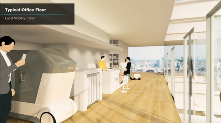 Компания также представит офисные этажи, конфигурацию которых можно будет кардинально изменить за счет внедрения мобильности в здании. На каждый этаж будет обеспечен прямой доступ с земли и с неба, а также будет создано «пространство мобильности», где будут сосуществовать небольшие транспортные роботы и порты для самокатов. Это также приведет к изменениям в том, как персонал будет работать и проводить свое время в офисе. На крыше и на средних этажах будут установлены взлетно-посадочные порты для самолетов вертикального взлета и посадки, а первый этаж будет иметь большую гибкость, обеспечивающую мобильность при входе и выходе.