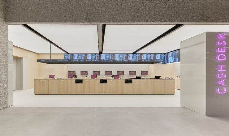 Среди других ключевых особенностей дизайна магазина — кассовые зоны, выполненные в виде скульптурных деревянных инсталляций. Крупные монолитные блоки расположены подобно островам и визуально выделяются в пространстве. В этих зонах установлены как традиционные кассы с персоналом, так и кассы самообслуживания, что улучшает общую организацию торгового процесса.