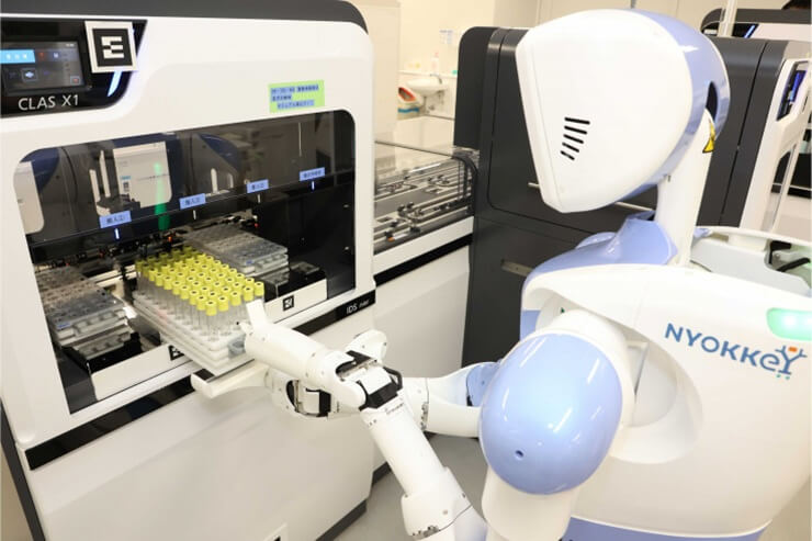 Это испытание стало первым в мире успешным примером совместной работы роботов, автоматизирующих весь процесс — от доставки клинических образцов до их загрузки в оборудование для клинических испытаний. В демонстрационном эксперименте работали два типа сервисных роботов: FORRO, робот для доставки лекарств в помещениях, и Nyokkey, автономный сервисный робот с рукой-манипулятором.
