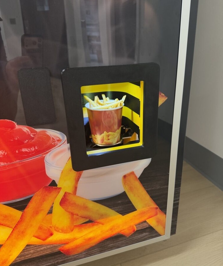 Торговый автомат вмещает 16 кг картофеля фри, а также имеет отделение для его жарки. В наличии имеется запас картофеля фри, 90% которого уже обжарено. После оформления заказа один из этих заказов снова отправляется во фритюрницу, чтобы завершить оставшиеся 10% процесса приготовления и гарантировать подачу блюда горячим. Заказы выдаются гостям в бумажных стаканчиках для картофеля фри. Кетчуп и соль можно приобрести на месте.
